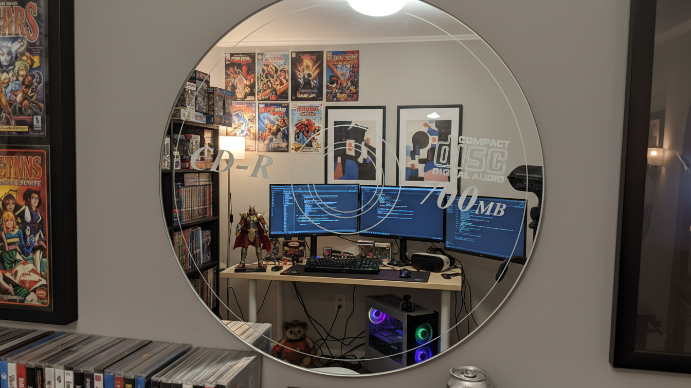 Specchio rotondo in vetro che riprende l’estetica dei vecchi CD-R, con incisioni che simulano la serigrafia del disco e creano un effetto grafico super nostalgico.