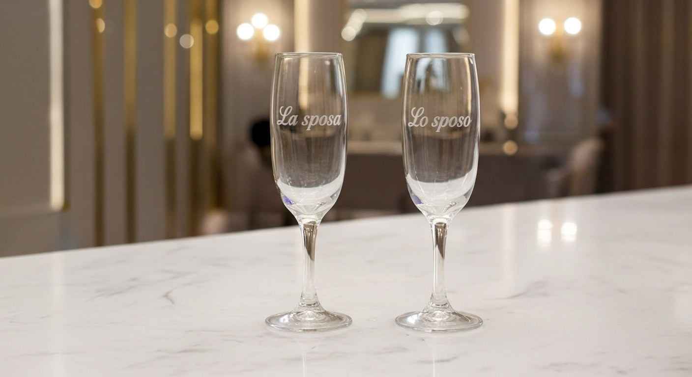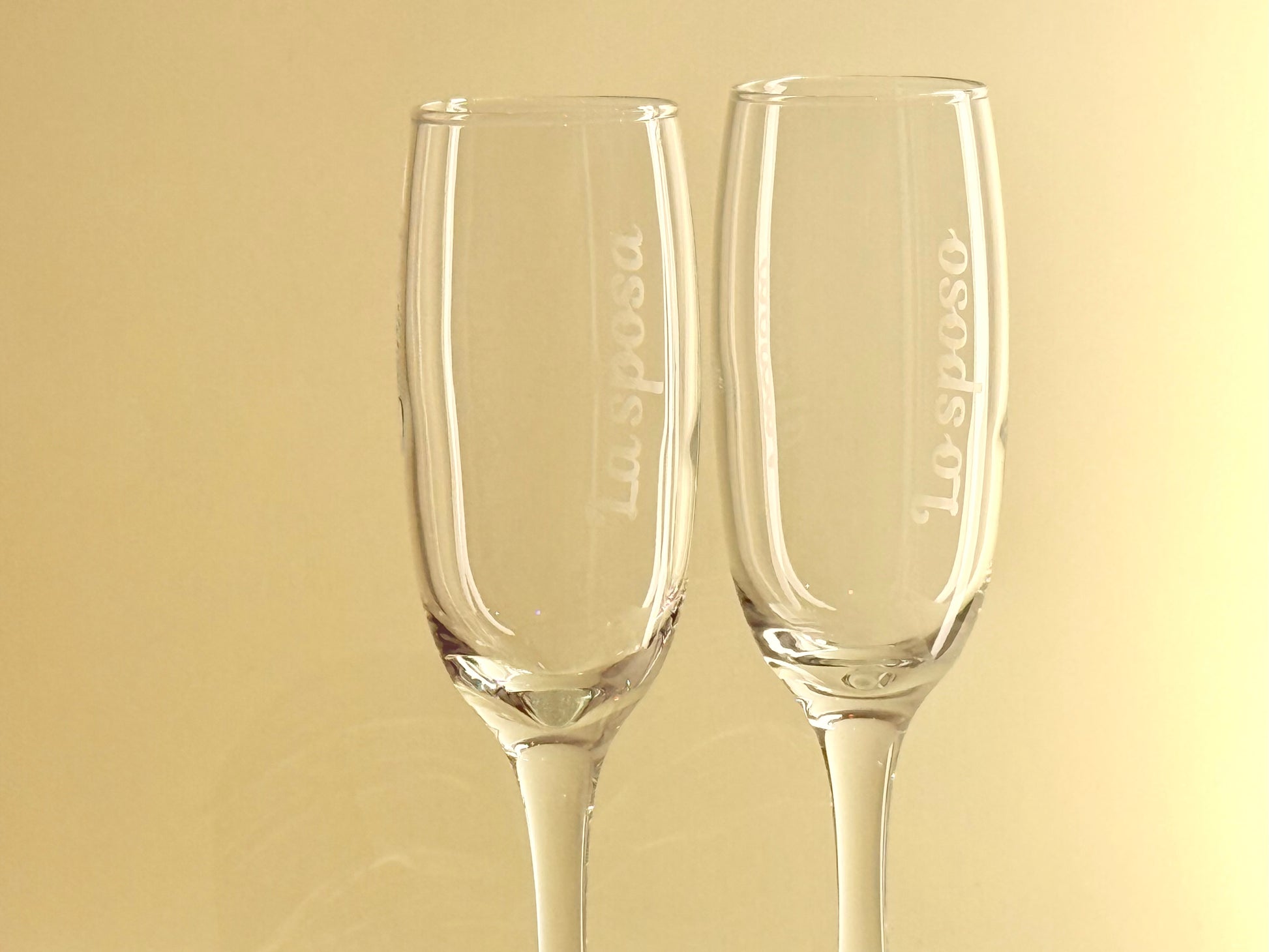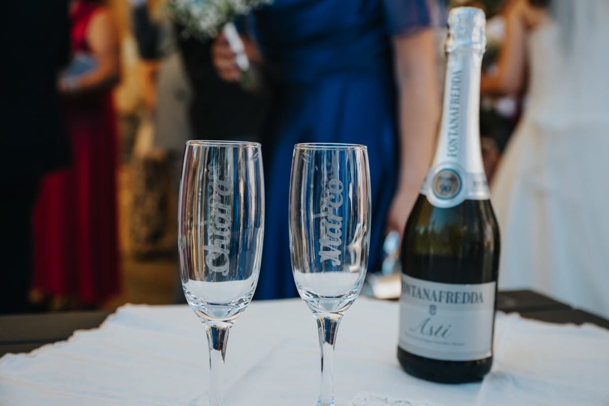 Coppia di Flute con i nomi degli sposi incisi su vetro.
